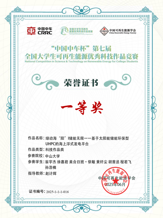 近日,由中国可再生能源学会主办的“中国中车杯”第七届全国大学生可再生能源优秀科技作品竞赛决赛在江苏省盐城市举行。本次竞赛共有来自全国305所高校的2013项作品参赛。永利官网2个本科生团队获得一等奖1项、三等奖1项,3个研究生团队获得三等奖3项。其中,本科生团队参赛项目《绿动海“阳”|储能无限——基于太阳能储能环保型UHPC的海上浮式发电平台》(参赛学生:翁宇杰、徐嘉君、美合日班·依敏、黄纤尘、胡首丞、程若飞、孙浩楠,指导教师:赵计辉)从众多作品中脱颖而出,荣获一等奖。