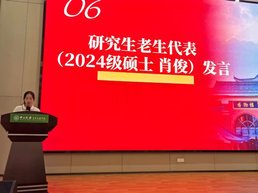 2025级水利工程专业硕士生胡敏代表研究生新生发言。她回顾了本科四年在学院的成长历程,从初入校园时对工程世界的好奇到参与创新训练项目、获得各种荣誉,再到推免保研继续深造,每一步都坚定了以专业报国的志向。她表示,作为中大土木研究生,将牢记习近平总书记的嘱托,践行"把论文写在祖国大地上"的时代要求,在科研探索中为国家基础设施建设和生态文明建设贡献力量。
