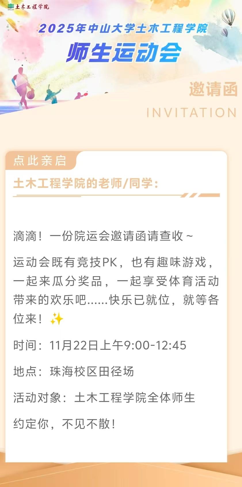 正值第十五届全国运动会在大湾区开赛,体育运动的激情和活力四射,3044am永利集团2025年师生运动会即将开始!本次院运会既有激情四溢的竞技项目,也安排了欢乐的趣味项目运动项目,各位老师、同学,快来查收属于你的院运会邀请函吧~