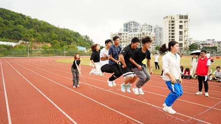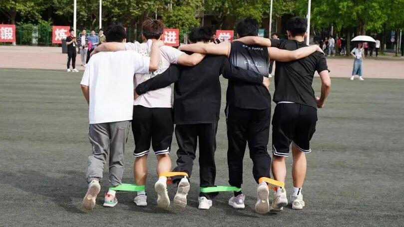 以班级为参赛单位,每组队伍5人,五个人相邻的脚绑在一起,跑向终点用时短的队伍获胜。