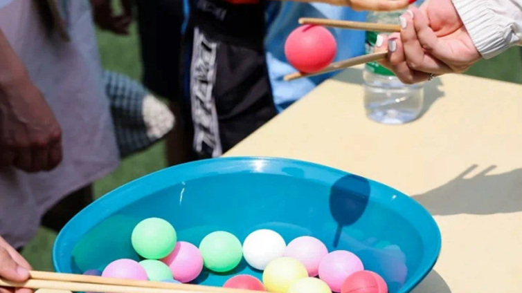 将若干乒乓球置于水盆中,参赛者在30s内尽可能多地 夹起乒乓球。根据夹起个数获取相应数目的盖章。