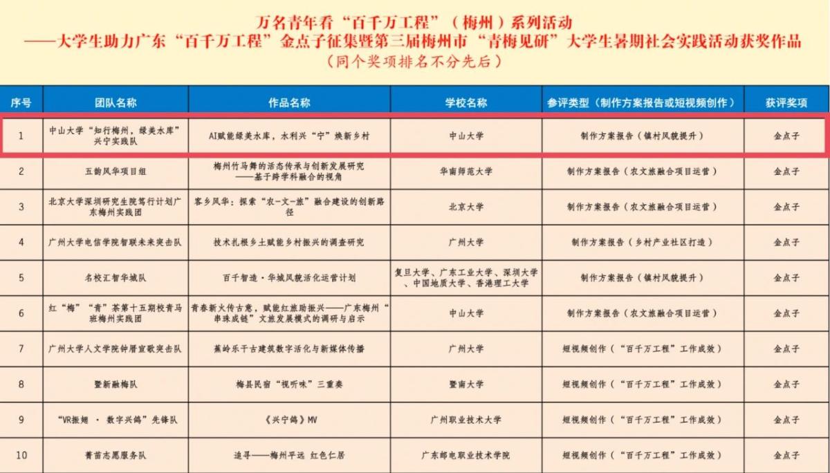 为深入学习贯彻党的二十届四中全会精神和习近平总书记在广东考察时的重要讲话精神,11月15-16日,由共青团梅州市委员会、梅州市“百千万工程”指挥部办公室、梅州市教育局等单位共同承办的大学生助力广东“百千万工程”金点子征集暨第三届梅州市“青梅见研”大学生暑期社会实践活动决赛在梅州市落下帷幕。永利官网“知行梅州,绿美水库”兴宁实践队提交的项目设计方案《AI赋能绿美水库,水利兴“宁”焕新乡村》从200余份作品中脱颖而出入围决赛。经过现场路演及答辩等环节的激烈角逐,荣获“金点子”荣誉!